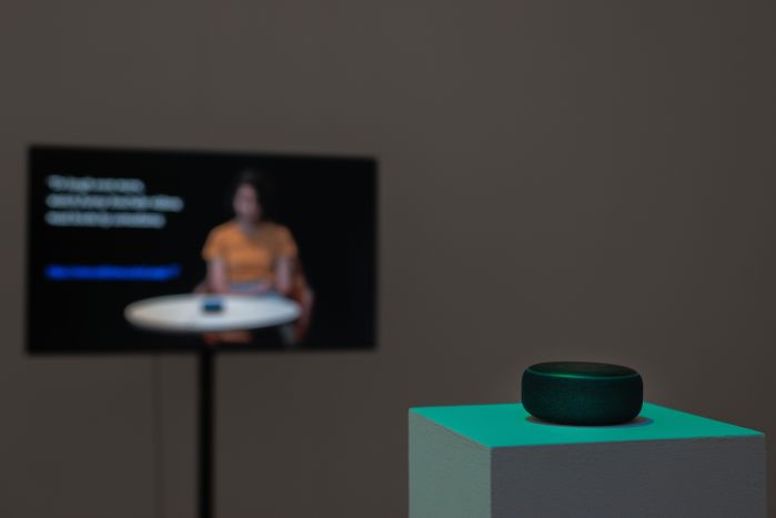 Proceeding from the technology of conversational voice-user interface (VUI) and its ex-tensive use in combination with virtual assistants such as smart home speakers or voice assistants, Talk to me…to you shows a non-linear narration of the protagonist and her day-to-day interaction with div. smart speakers.
